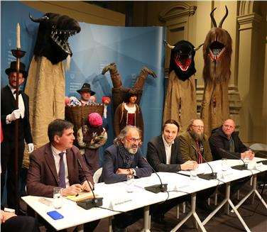 - Oggi a Palazzo Widmann la presentazione della candidatura UNESCO della Sfliata dell'Egetmann con politici, organizzatori e alcuni figuranti e maschere del corteo stesso, fra i quali tre imponenti "Schnappviecher" da sx: il sindaco di Termeno Wolgang Oberhofer, l'onorevole Manfred Schullian, l'assessore provinciale Philipp Achammer, Giovanni Kezich, direttore Museo Usi e Costumi Gente Trentina, e Günter Bologna, presidente Associazione dell'Egetmann (Foto: USP/I.Dejaco) [JPG 29 KB]