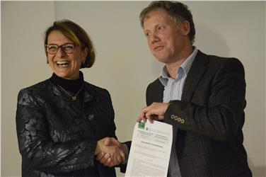 La firma della convenzione di collaborazione fra l’ I.T.C.A.T. “Delai” e il Collegio dei Geometri e Geometri Laureati, il 9 marzo 2017, a cura della preside Paola Burzacca (a sx) e del presidente del Collegio, Gert Fischnaller (Foto:USP