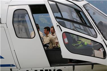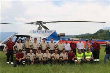 - Foto di gruppo con l'assessore Schuler (7. da dx), il dir. Dipartimento Unterweger (5. da d), il comandante VdF Alber (6. da dx), l'ispettore Meraner (a sx), il dir. uff. Foreste Schöpf (4.da dx) e il pilota di elicottero (a dx) Foto: USP/M.Clara [JPG 19 KB]