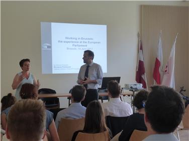 Il ragazzi hanno anche incontrato Markus Warasin, altoatesino di origine, che dall'inizio dell'anno fa parte dell’ufficio di gabinetto del Presidente del Parlamento, Antonio Tajanj. Attraverso la relazione della trentina Chiara Bolner, i partecipanti hanno potuto quindi avere una panoramica della attività della Commissione europea. A seguire si è svolto un incontro con i deputati europei Herbert Dorfmann e Karoline Graswander-Hainz che hanno dialogato con gli studenti illustrando la loro esperienza di lavoro all’interno del Parlamento europeo. La prevista visita al Parlamento europeo è invece stata invece disdetta a causa dell’attentato terroristico a Bruxelles. L’idea della Accademia dell’Euregio è nata per iniziativa dell’Euregio Tirolo-Alto Adige-Trentino, in collaborazione con la Fondazioen Alcide De Gasperi di Trento. Il percorso si rivolge a studenti e anche a giovani adulti, che hanno già iniziato il proprio percorso professionale. Questioni centrali del programma sono le basi della cooperazione transfrontaliera, il suo funzionamento quotidiano e come i singoli cittadini possano vivere e dare forma all’Euregio.