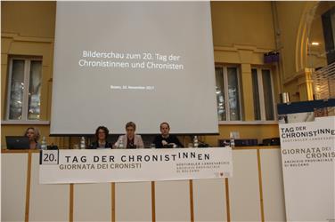 Davanti a una cinquantina di cronisti di paese Marlene Huber e Alessandro Campaner dell'Archivio provinciale hanno riferito in merito al progetto Interreg "Argento vivo" che riguarda tutti coloro che si occupano di fotografia storica nel territorio dell'Euregio. Uno sguardo sul panorama culturale e sullo sviluppo degli insediamenti è stato quindi gettato dal direttore dell'ufficio provinciale Natura, paesaggio e sviluppo del territorio, Peter Kasal e dal suo collaboratore Georg Praxmarer. La Giornata dei cronisti di paese si è poi conclusa con una visita guidata al Museo di scienze naturali.