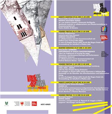 Prende il via sabato 9 giugno la seconda edizione di “Vadena proposte”, un progetto sostenuto dal Dipartimento alla cultura italiana della Provincia di Bolzano e dal Comune di Vadena che porta spettacoli e concerti nel paese poco a sud del capoluogo. Da due anni il comune della Bassa atesina si è dotato di un piano culturale d’area, un progetto “partecipato” che si propone di valorizzare quanto già c’è nei diversi ambiti culturali e sociali. “Vadena Proposte è inoltre un´opportunità per conoscere e scoprire  Vadena attraverso la cultura, un nuovo contenitore di luoghi e di eventi”, spiega l’assessore Christian Tommasini. Il 2017 è stato il primo anno di questa nuova esperienza, resa possibile dalla collaborazione tra le associazioni del territorio e la pubblica amministrazione. “Il nostro Comune – spiega l’assessora comunale Martine Parise – pur essendo di piccole dimensioni è in grado di offrire proposte molto varie. L’anno scorso abbiamo avuto una partecipazione al di sopra delle aspettative, ma soprattutto abbiamo iniziato un nuovo e significativo rapporto con enti di produzione e organizzazione culturale  come Teatro Stabile di Bolzano, Bolzano Danza, Vereinigte Bühnen Bozen, che in qualche modo rivedono il concetto stesso di periferia i modi e i luoghi della loro proposta culturale complessiva”.