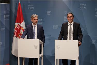 - L'assessore Schuler (sx) e Kompatscher durante la conferenza stampa. Foto: USP/sf [JPG 13 KB]