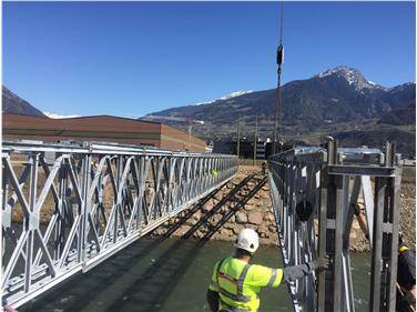 Il ponte provvisorio in metallo allestito a Maia Bassa all’altezza della cooperativa frutticola Cafa consente l’accesso dalla superstrada MeBo al cantiere sulla sponda orograficamente sinistra - Foto: Sistemazione bacini montani sud