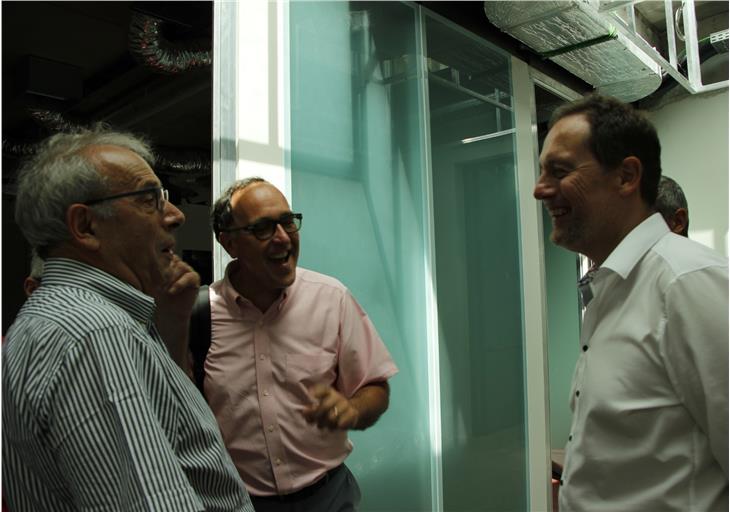 - L'assessore Massimo Bessone, 2° da dx, ha prospettato ai futuri utenti, qui Michael Oberhuber (3° da dx) del Centro di sperimentazione Laimburg, la possibile consegna parziale dell’edificio polifunzionale a Laimburg entro il 2019 - Foto: [JPG 70 KB]