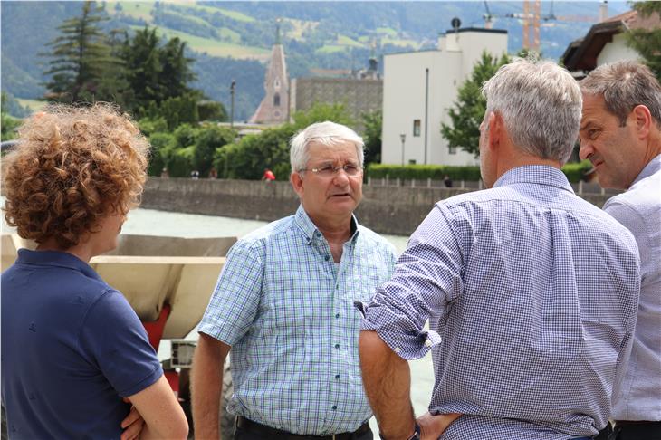 L’assessore alla Protezione civile Arnold Schuler, il capo Dipartimento Klaus Unterweger e il direttore dell’Agenzia per la Protezione civile Rudolf Pollinger hanno svolto ieri (20 giugno) insieme ai sindaci e ai tecnici un sopralluogo a tre cantieri in Valle Isarco e Alta Valle Isarco. A Bressanone l’intervento, attualmente in fase di realizzazione del secondo lotto e coordinato dall’Ufficio bacini montani Nord dell’Agenzia per la Protezione civile, riguarda la messa in sicurezza dell’Isarco all’altezza dell’abitato per evitare alluvioni. Le opere si riferiscono al tratto compreso fra ponte "Auenhausbrücke" e il ponte pedonale "Bombenbrüggele". I costi ammontano a 1 milione di euro, finanziati attraverso il programma operativo del FESR 2014-20.