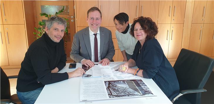 - L'assessore Bessone con il progetto del palazzo assieme ad Andrea Sega (Ufficio edilizia est), Lara Marinelli (Ufficio affari amministrativi) e Marina Albertoni (Ripartizione edilizia e servizio tecnico) (Foto: ASP/Anna Pitarelli) [JPG 40 KB]