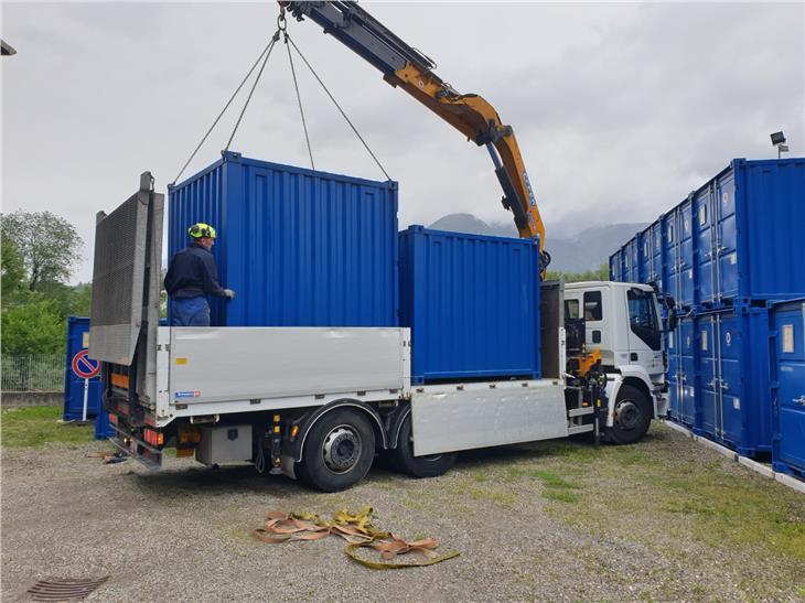 I collaboratori dell’Agenzia per la Protezione civile provinciale hanno caricato due container, con rispettivamente 7600 e 8800 sacchi di juta. Verso le ore 18.00 un camion è partito dal magazzino del servizio di piena di Marlengo con i container per trasportarli con circa 3 ore di viaggio a Marzaglia sul Secchia in provincia di Modena, dove verranno impiegati per far fronte alla situazione critica a seguito delle recenti piogge.