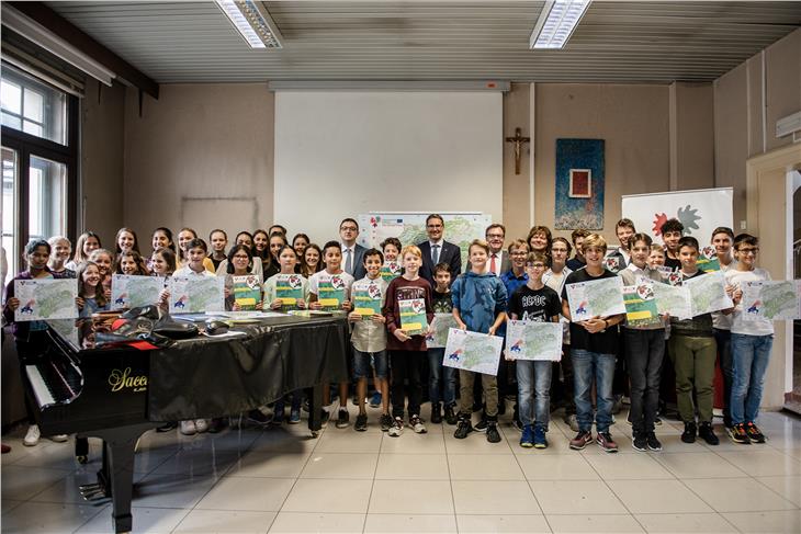 Approfondire la conoscenza dell'Euregio Tirolo-Alto Adige-Trentino e rafforzare l'interesse di bambini e ragazzi verso le regioni confinanti con una storia in comune. Questo l'obiettivo che si vuole raggiungere con la nuova cartina geografica dell'Euregio, i cui primi esemplari sono stati consegnati questa mattina (25 settembre) dai presidenti Arno Kompatscher, Günther Platter e Maurizio Fugatti ai ragazzi di due scuole di Bolzano: la scuola media "Josef Aufschnaiter" e la scuola elementare "Dante Alighieri". Il progetto è stato coordinato dalle Sovrintendenze scolastiche italiana e tedesca, dall'Ufficio programmazione e organizzazione del Trentino e dalla Bildungsdirektion del Tirolo.