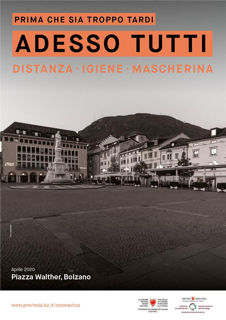 Il Covid-19, la malattia causata dal coronavirus, è attualmente il pericolo maggiore per la società: la Provincia di Bolzano ne è convinta e non si affida solo a misure preventive ma anche alla campagna di sensibilizzazione "Adesso tutti". Partita il 22 ottobre scorso con affissioni in luoghi pubblici e pubblicità su carta stampata e online, la campagna è suddivisa in tre fasi.