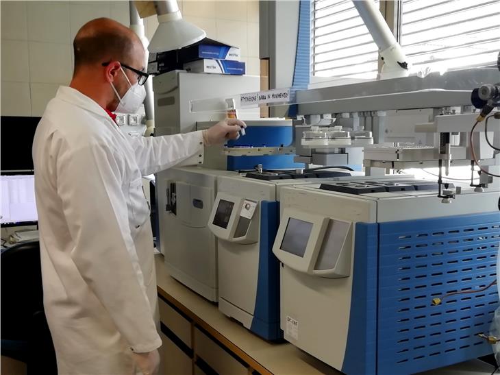 - Flavio Ciesa, collaboratore del Laboratorio analisi e sicurezza dei prodotti, utilizza strumentazione analitica all’avanguardia per effettuare analisi sui colori per tatuaggi. (Foto: ASP/Nadia Franzoi) [JPG 56 KB]