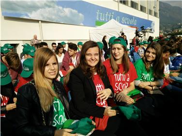 Staatspräsident Mattarella unterstrich in seiner Eröffnungsrede in Sondrio die große Bedeutung von Bildung und Kultur als Garant und Voraussetzung für Fortschritt, Wohlstand und Demokratie. Er hob in seiner Rede auch das gleiche Recht für alle auf Schulbildung und Solidarität als Grundwert von Zivilgesellschaften hervor. Dabei verstand er es vortrefflich, seine Botschaften mit anschaulichen Mitteln zu untermaurern. So erzählte er zum Beispiel von seiner letzten Reise nach Äthiopien, bei der Kriegswaisen ihn nicht etwa um Konsumartikel sondern um Schulmaterial baten, um einen Zugangg zu Bildung also. Die Frankenberger Zuhörerinnen in Sondrio hat dieses Streben nach Bildung afrikanischer Heranwachsender stark beeindruckt. Auch die Anstrengungen der vom Erdbeben im August betroffenen Gebiete, zuallererst die Schulgebäude wiederum zu errichten und den Schulbetrieb aufzunehmen, begeisterte die Teilnehmer - zumal die in Filmen zugespielten Schulklassen bei der Eröffnung auch anwesend waren. So gut wie alle schulisch-gesellschaftlich relevanten Themen unserer westlichen Gesellschaften fanden bei den Eröffnungsfeierlichkeiten Eingang: Flüchtlinge, Mobbing – Cybermobbing, Digitalisierung, die veränderte Rolle der Frau in der Gesellschaft usw.