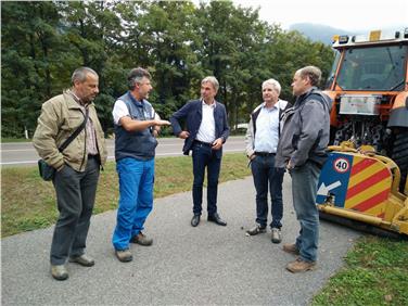- Am Radweg in Neumarkt (v.re.): Amtsdirektor Egger, Direktor Pollinger, Landesrat Schuler, Vorarbeiter Helmut Gurndin, Giorgio Coli. Foto: Agentur für Bevölkerungsschutz/Judith Weissensteiner [JPG 28 KB]