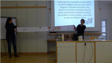 Die beiden Kursleiter, Mathilde Aspmair vom Bereich Innovation und Beratung und Markus Fritz vom Amt für Bibliotheken und Lesen, betonten, dass die Teilnehmerinnen und Teilnehmer bei der abschließenden Präsentation der Abschlussarbeiten mit sehr innovativen, vielfältigen und kreativen Beispielen überrascht hätten. Unter anderem entwarfen sie eine „Leserolle“ als kreative Methode zur Vorstellung eines Buches. Dadurch sollen die Kinder auf das Buch neugierig bemacht und animiert werden, es selber zu lesen.