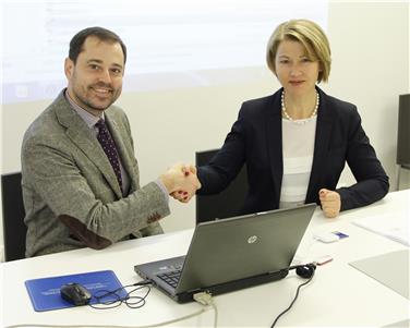 - Digitale Unterschrift erfolgreich unter den Vertrag gesetzt: Die Päsidentin der Alperia Energy, Paulina Schwarz, und der Direktor der Agentur für die Verfahren, Thomas Mathà. Foto: LPA/mgp [JPG 17 KB]