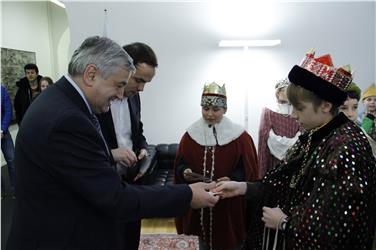 „60 Kinder umfasst unsere Ministrantengruppe“, erzählte Begleiterin Samira, die gemeinsam mit Peter, Simon und Maria die Kindergruppe betreut. „Und ja, sie haben beim Sternsingen viel Spaß – heute erst recht, wo sie im Saal der Landesregierung sitzen dürfen und eine Jause bekommen!“