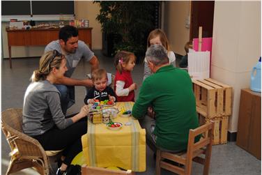Hinweisschilder aus alten Tonnendeckeln, Packpapier und Papiermaché führten die Besucher in die verschiedenen Stationen. Der Renner war das Spielezimmer – ausgestattet mit einer Küche und einer Waschmaschine aus Karton sowie weiteren neun Spielen aus "Altmaterial", die besonders die kleinen Gäste zum Spielen aufforderten.