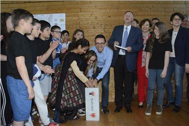 - Landesrat Tommasini hat die Schülerinnen und Schüler in die Feierlichkeiten zur Grundsteinlegung mit einbezogen. Foto: LPA/L.Canins [JPG 16 KB]
