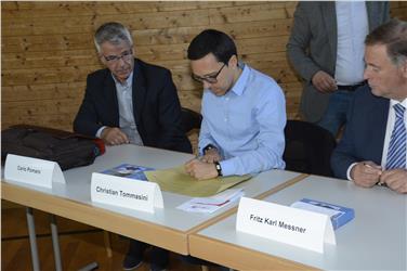- Landesrat Tommasini (Mitte) und Bürgermeister Messner (r.) haben die Pergamentrolle unterzeichnet, die im Grundstein hinterlegt wurde – links: Carlo Pomaro, Direktor des Amtes für Schulfinanzierung. Foto: LPA/L. Canins [JPG 17 KB]