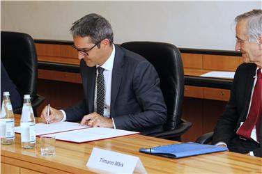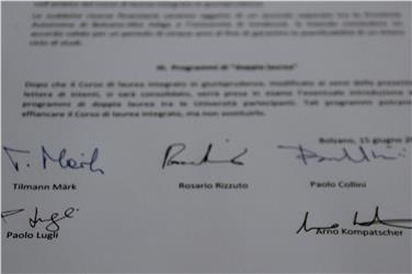 - Rektro Lugli von unibz ist an der Reihe, das Abkommen zu unterzeichnen; im Vordergrund Bildungslandesrat Philipp Achammer. Foto: LPA/mb [JPG 18 KB]
