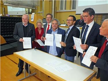 - Das Einvernehmensprotokoll ist unterzeichnet: Boz (AGB), Mariapaola Manovali (SGK), Stephan Vieider (ASGB), Bruni Falcomatá (SGB), LR Tomasini, Schweigkofler (Wobi) und Primo Schönsberg (Wobi) (FOTO: LPA/Werner Stuppner) [JPG 23 KB]