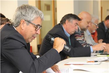 - Die Kapitel Wirtschaft und Landwirtschaft sind etwas geschrumpft, werden aber über den Nachtragshaushalt aufgestockt. Im Bild: Federico Giudiceandrea (Unternehmerverband), im Hintergrund einige Vertreter der Gewerkschaften. Foto: LPA/mgp [JPG 16 KB]