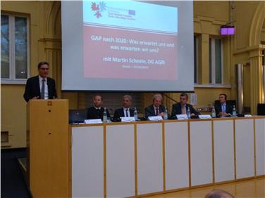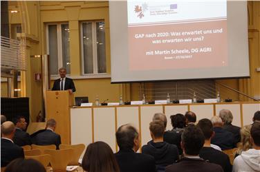 Den Hauptvortrag eröffnete Martin Scheele - seit 2012 Leiter des Referats "Konzeption und Kohärenz der Ländlichen Entwicklung" der EU-Generaldirektion Landwirtschaft und Ländliche Entwicklung - mit den grundlegenden Aussagen des EU-Präsidenten Jean Claude Juncker zur Ausrichtung der Gemeinsamen EU-Agrarpolitik: Diese müsse den Anforderungen der Gesamtgesellschaft gerecht werden – und dazu gehören Fragen zur Lebensmittelsicherheit ebenso wie Fragen zum Umweltschutz und zum Klimawandel. Juncker sei, unterstrich Scheele, zudem überzeugt, dass eine grundlegende Einkommensstützung und ein effektives Sicherheitsnetz für die Landwirte in Form von Direktzahlungen wesentlicher Bestandteil jeder zukünftigen Agrarpolitik sein müsse. Zum zentralen Anliegen müsse künftig ein besseres Ressourcenmanagement erstellt werden, denn eine nachhaltige Produktion erfordere deutlich höhere Investitionen in Innovation, neue Technologien und Wissenstransfer. Dies bezeichnete Scheele als eine neue Herausforderung, aber auch als Chance, um die Wettbewerbsfähigkeit zu steigern.