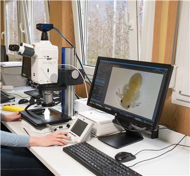 - In den Labors des Versuchszentrums Laimburg werden Pflanzenschutz und Pflanzengesundheit unter die Lupe genommen. Auf dem Bildschirm eine Larve des Blattsaugers, Überträger der Erreger des Besenwuchses. Foto: LPA/Versuchszentrum Laimburg [JPG 27 KB]