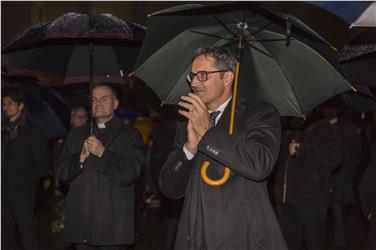 - Landeshauptmann Arno Kompatscher mit Bischof Ivo Muser bei der heutigen Feier am Gerichtsplatz - Foto: LPA/Oskar Verant [JPG 12 KB]