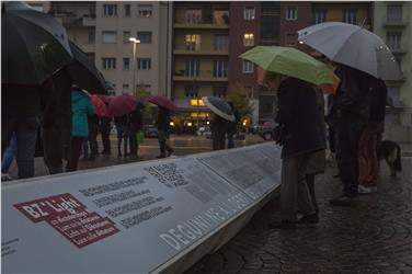 Das Relief am Finanzgebäude in Bozen war als "Haus des Faschismus" nach den Plänen der Architekten Paolo Rossi und Luis Plattner errichtet und 1942 fertiggestellt worden. An der Stirnseite befindet sich das monumentale Relief des Klausener Künstlers Hans Piffraders, das den Leitspruch der italienischen Faschisten "Credere, obbedire, combattere" ("Glauben, gehorchen, kämpfen") wiedergibt. Auf der Grundlage eines vom Land Südtirol 2011 ausgelobten Ideenwettbewerbs wurde das Relief nun neu gestaltet. Unter knapp 500 Vorschlägen entschied sich die Jury für das Projekt der beiden Künstler Arnold Holzknecht und Michele Bernardi. Sie wollen mit ihrem Projekt und der Lichtschrift mit dem Zitat von Hannah Arendt das faschistische Relief umdeuten. Diese Neugestaltung und Umdeutung des Denkmals wurde heute gefeiert. Jugendliche der drei Sprachgruppen rezitierten bei der Feier am Gerichtsplatz Passagen aus "Schöne Welt, böse Leut" von Claus Gatterer, aus "Unvergessen" von Franz Thaler, aus "Se questo è un uomo" von Primo Levi sowie das Hannah-Arendt-Zitat, das nun vor dem Relief leuchtet. Nach einer Schweigeminute wurde vor dem Hintergrund der Klänge des Haydn-Orchesters der Schriftzug illuminiert. Am Gerichtsplatz steht nun zudem eine Stele mit Informationen zu Denkmal und Geschichte.
