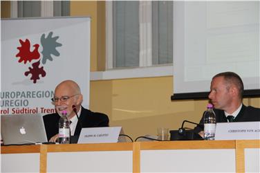 - Der geschäfstführende Generalsekretär der Europaregion Tirol-Südtirol-Trentino von Ach(re.) und der Präsident des Kulturverbandes "Die Schätze des historischen Tirol" Cailotto (li.) bei der Tagung. Foto: LPA/mac [JPG 14 KB]