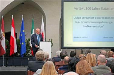 Landeshauptmann Arno Kompatscher bewertete das Grundsteuerpatent des österreichischen Kaisers Franz I. vor 200 Jahren als Erfolg. „Der Kataster schafft nicht nur Rechtssicherheit, sondern auch Transparenz, und ist ein wichtiges Steuerungselement nicht nur für die Wirtschaft, sondern vor allem auch für die Südtiroler Gesellschaft“, betonte Kompatscher. Für ein funktionierendes demokratisches Gemeinwesen ist der Kataster somit laut Landeshauptmann wesentlich.