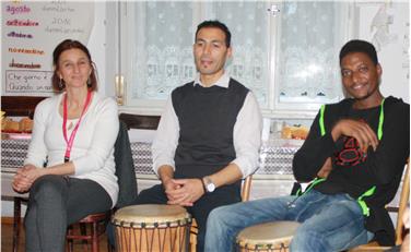 - Koordinatorin Roswitha Tedeschi und der marokkanische Mitarbeiter Omar sowie ein Asylbewerber - Foto: LPA/FG [JPG 18 KB]