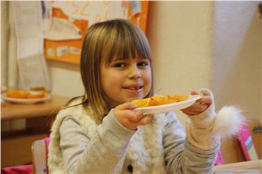 Kaki in Schnitten, Mandeln, Haselnüsse und Honig auf einem Teller angerichtet haben heute die Schülerinnen und Schüler der Grundschule "Dante Alighieri" in der Bozner Sparkassenstraße erhalten. Kindern gesunde Ernährung schmackhaft machen und damit ihre Essensgewohnheiten nachhaltig verbessern: Das ist Ziel des italienweit laufenden EU-Projektes "Frutta e verdura nelle scuole", Obst und Gemüse an den Schulen, an dem Südtirol in diesem Schuljahr zum neunten Mal teilnimmt.