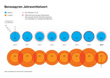 - Infografik Benzo(a)pyren: In einigen ländlichen Gemeinden (Beispiel Latsch) überschreiten die Benzo(a)pyren-Werte den EU-Zielwert bei Weitem, die Ursache liegt in der unsachgemäßen Holzverbrennung. [JPG 16 KB]