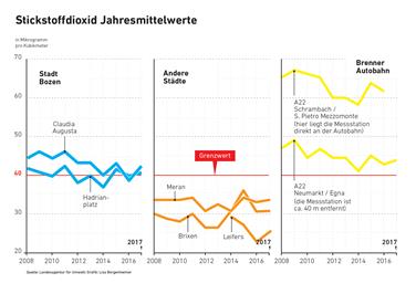 Zu den größten Herausforderungen gehört nach wie vor die Einhaltung der Stickstoffdioxid-Grenzwerte (NO2) entlang der Brennerautobahn (A22) und an den verkehrsreichen Straßen in den Städten. Die EU hat im Jahr 2010 für Stickstoffdioxid (NO2) einen Jahresgrenzwert von 40 Mikrogramm pro Kubikmeter (µg/m3) festgelegt. "Obwohl wir bereits 2010 ein erstes Programm zur Reduzierung der NO2-Belastung beschlossen und zahlreiche Maßnahmen umgesetzt haben, müssen wir feststellen, dass wir diesen Grenzwert an vielen Stellen im Land überschreiten", betont Landesrat Theiner, "insbesondere entlang der Brennerautobahn, aber auch in der Nähe von einzelnen Straßen in Bozen und Meran, sowie in Brixen und Leifers." So wurden unmittelbar an der A22, bei Schrambach, 2016 62 Mikrogramm je Kubikmeter gemessen, bei Auer, in einer Entfernung von 30 Metern von der Autobahn, 44 Mikrogramm", erklärt Luca Verdi. In Bozen lagen die Jahresdurchschnittswerte 2017 am Hadrianplatz bei 42, in der Claudia-Augusta-Straße bei 43 Mikrogramm pro Kubikmeter, also ebenfalls über dem Grenzwert.