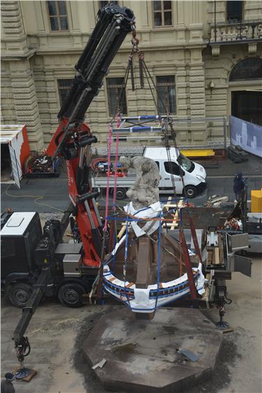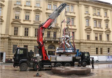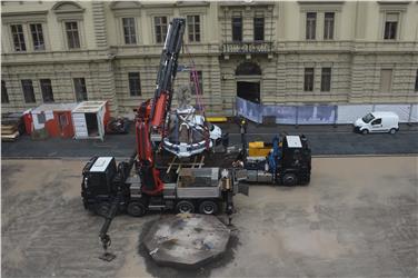 - Vorsichtig wird der Laurin-Brunnen mit dem Kran versetzt (Foto: LPA/Lidia Canins) [JPG 20 KB]