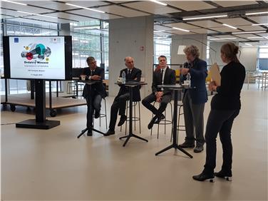 - Haben die Ausstellung eröffnet (v.l.): Amtsdirektor Andrea Sega, der Präsident des Organisationskomitees Bruno Gabbiani, Wirtschaftsressortchef Ulrich Stofner und Bauherr Reinhold Messner (Foto: LPA/Abteilung Hochbau) [JPG 21 KB]