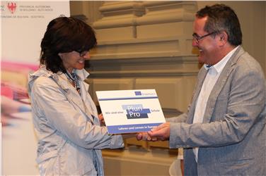 Diese Möglichkeit des Über-Grenzen-Hinausschauens nannte auch die Direktorin des Klassischen, Sprachen- und Kunstgymnasiums mit Landesschwerpunkt Musik Walther von der Vogelweide in Bozen Martina Adami als den wichtigsten Grund für die Teilnahme am Projekt PluriPro. Sie nahm heute die PluriPro-Plakette für ihre Schule entgegen; den anderen 29 Schulen wird die Plakette zugeschickt, sie soll im Schulgebäude angebracht werden, um dem Projekt Sichtbarkeit zu verleihen und zu weiteren Fortbildungen im Ausland anzuregen. Eine Fortbildung direkt vor Ort sei eine enorme Chance, um richtig in die Sprache einzutauchen, führte Direktorin Adami weiter aus. Wichtig seien auch die neuen Inputs und die Kommunikation mit Kolleginnen und Kollegen in Südtirol und im Ausland. Zu den wertvollen Erfahrungen zählen auch das Wahrnehmen unterschiedlicher Lernformen und der Rollenwechsel der Lehrpersonen, die wieder selber zu Lernenden werden.