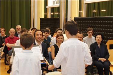 Die Feierstunde wurde von einem acht- und einem neunjährigen Schlagwerk-Schüler der Musikschule Bozen mit ihrem Lehrer musikalisch gestaltet.