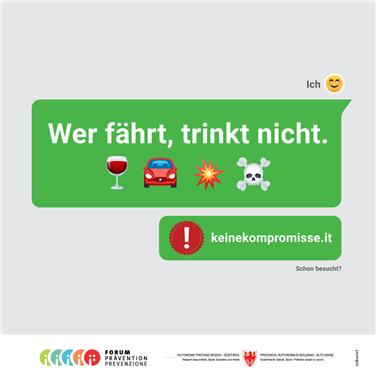 Laut neuesten Daten liegt Südtirol beim täglichen Konsum von Alkohol unter dem staatlichen Durchschnitt. "Diese positive Entwicklung erfreut uns ganz besonders und ist auch der seit 2007 kontinuierlich wiederkehrenden Kampagnen-Arbeit mit den Experten unserer Fachdienste und dem Forum Prävention geschuldet", begrüßte Gesundheitslandesrätin Martha Stocker das Fortsetzen der Alkoholpräventionskampagne. Die crossmediale Kampagne "Keine Kompromisse" setzt auf einen modernen und einprägsamen Kommunikationsstil, nämlich jenen der "Handy-Chat"-Ästhetik. "Wie eine WhatsApp-Nachricht schafft es die Kampagne Aufmerksamkeit zu wecken. Die Betrachter werden auf sympathische Art und Weise zu einer kritischen Haltung bezüglich Alkohol ermutigt", machte Peter Koler vom Forum Prävention bei der heutigen (15. November) Vorstellung deutlich.