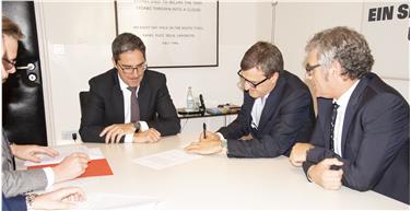 LH Kompatscher, Selfin-Präsident Helfer und Gemeindenverbandspräsident Schatzer bei der heutigen Unterzeichnung - Foto: LPA/Barbara Franzelin