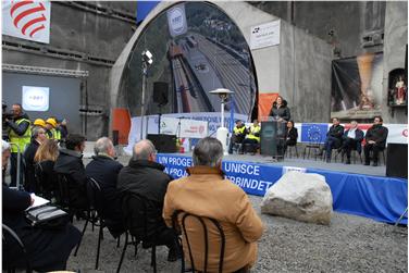 Kommissarin Bulc gratulierte zu den bereits geleisteten Arbeiten und bezeichnete den BBT als „Flagschiff“ und Vorzeigemodell der Verkehrsvorhaben der EU, das für jedes Land der EU wichtig sei, da es Verkehrsnetze verbinde. „Es liegt in unserer Verantwortung, sicher zu stellen, dass es Lebensqualität und saubere Luft gibt, insofern wird dieser Tunnel auch Leben retten“, sagt Bulc. Die EU werde damit fortfahren, den Bau des BTT zu unterstützen, unterstrich sie und hob hervor, dass der BBT künftig das prioritäre Verkehrsprojekt der EU sein sollte. „Der BBT wird mit 64 Kilometern außerdem die längste unterirdische Eisenbahnverbindung der Welt, darauf sollten wir stolz sein“, sagte Bulc.