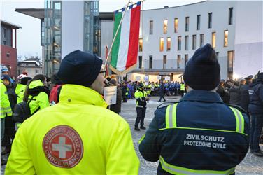 - Südtiroler Zivilschützer bei der Eröffnung der Zivilschutz-Skimeisterschaft am Rathausplatz in Bruneck. Foto. LPA/Peter Daldos [JPG 22 KB]