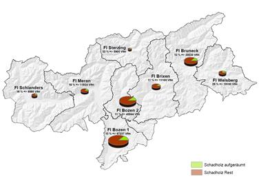"Die Aufräumarbeiten nach den Unwetter- und Windwurfereignissen von Ende Oktober", berichtet der Direktor der Abteilung Forstwirtschaft Mario Broll, "wurden schon im November aufgenommen, ab Mitte Jänner hat das Forstpersonal den Stand der Arbeiten erhoben: Am 17. Jänner, also zweieinhalb Monate nach dem Unwetter, waren bereits mehr als 200.000 Vorratsfestmeter Schadholz aufgearbeitet". Diese Holzmenge entspricht rund 14 Prozent der geschätzten Sturmholzmenge und etwa einem Drittel der durchschnittlichen landesweiten Nutzungen pro Jahr.