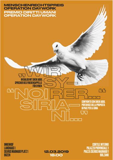 Seit 2007 unterstützt das Land Südtirol die Tätigkeit des gemeinnützigen Vereins Operation Daywork, in dem Ober- und Berufsschüler aus Südtirol und dem Trentino für die Entwicklungszusammenarbeit und die soziale Gerechtigkeit engagieren. Im Programm des Vereins steht unter anderem die jährliche Verleihung eines Menschenrechtspreises. Der diesjährige Preis geht an den Syrer Abdel Rahim Hysan, besser bekannt als Sheik Abdo, für dessen Fürsorge für syrische Flüchtlingskinder und dessen Friedensappell für Syrien. Er wird in einer öffentlich zugänglichen Feier den Preis aus den Händen von Landeshauptmann Arno Kompatscher entgegennehmen und über seinen Appell sprechen: