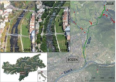 - Die Talfer in Bozen vor (2008) und nach (2018) den Revitalisierungsarbeiten. Fotos: Agentur für Bevölkerungsschutz [JPG 28 KB]