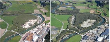 - Wiedergewinnung naturnaher Flussabschnitte an der Ahr in der Gatzaue bei Gais; im Jahr 2005 links, 2017 rechts im Bild. Ein vitaler Auwald wirkt als natürliche Rückhaltefläche bei Hochwasser. Foto: Agentur für Bevölkerungsschutz [JPG 16 KB]