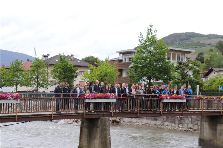 - Der EFRE-Begleitausschuss auf der Fußgängerbrücke über den Eisack, die 22 Meter flussabwärts versetzt wird. Foto: LPA/Maja Clara [JPG 64 KB]