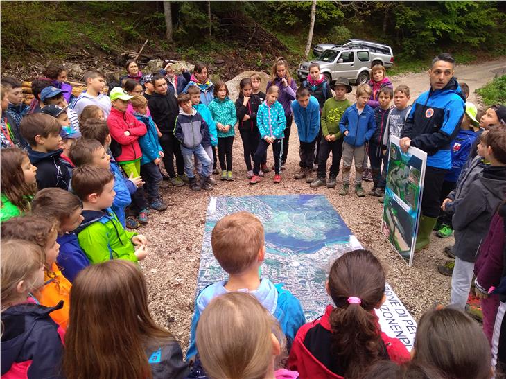 Bei einem Forst-Wildbach-Tag wurde 70 Kindern der Grundschule Tisens das Prinzip des Hochwasserschutzes vor Augen geführt. Foto: Agentur für Bevölkerungsschutz